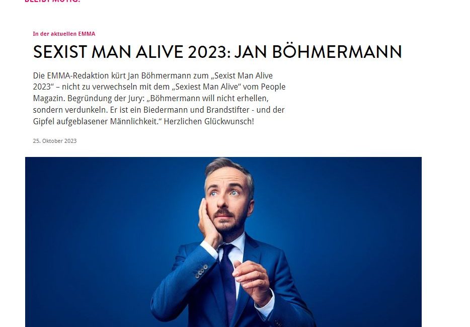 Die renommierte Frauenzeitschrift “Emma” unter der Herausgeberschaft von Alice Schwarzer hat Jan Böhmermann, den Moderator des ZDF, satirisch als den “Sexiest Man Alive” gekürt.