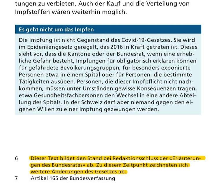 Aber die prominent hervorgehobene Infobox «Es geht nicht um das Impfen» muss als bewusste Irreführung taxiert werden. Bei Drucklegung des Abstimmungsbüchleins war die neuste Fassung des Covid-19-Gesetzes bekannt, in dem in Art. 3 ein Impfplan und Sonderrechte für Geimpfte und in Art. 6 ein Impfpass (ein fälschungssicherer «Nachweis») per Gesetz eingeführt werden. Mit dem Hinweis führt der Bundesrat die impfkritische Bevölkerung in die Irre.