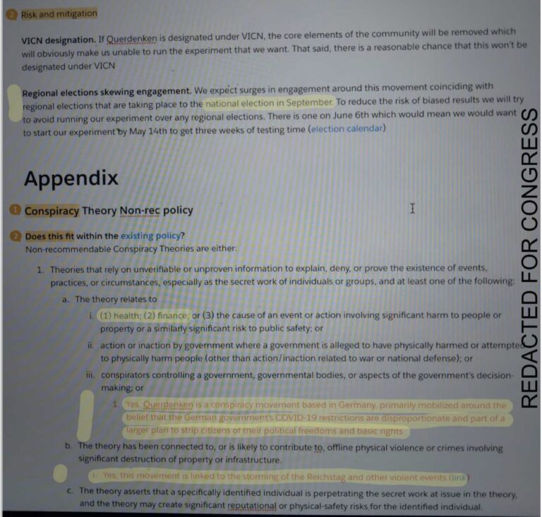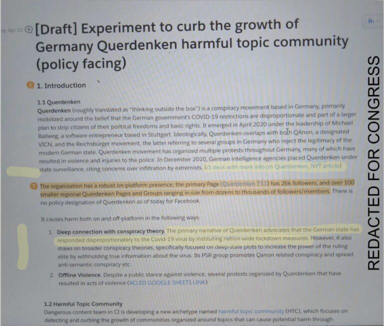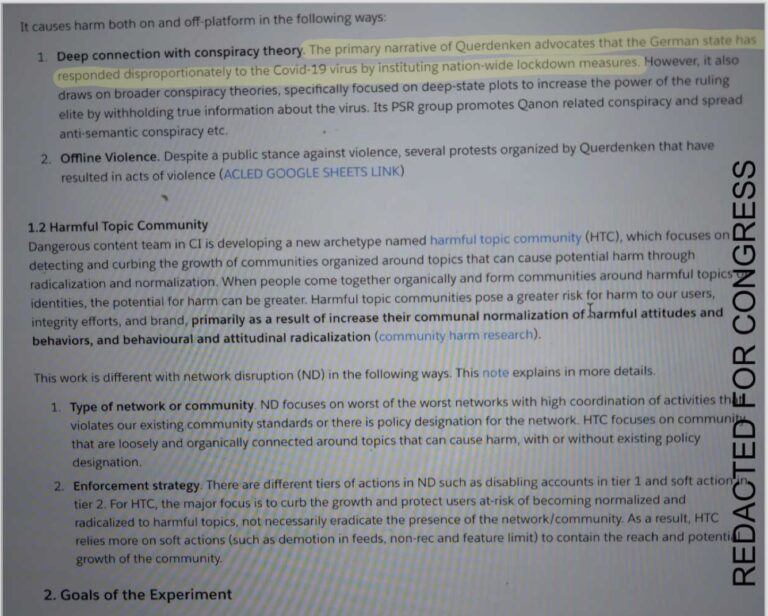 Aus den für die Anhörung im US-Kongress bereitgestellten Unterlagen wird klar – Auch vor der Löschung der Social-Media-Seiten auf den eigenen Plattformen Instagram und Facebook versuchte der Internet-Konzern die Reichweite von Querdenken im Vorfeld zur Bundestagswahl einzudämmen („We can curb the growth of Querdenken community“).