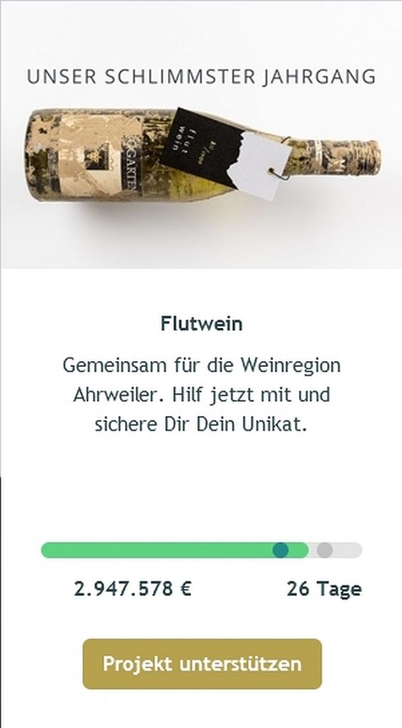 Sie unterstützen mit dem Kauf von Flutwein nicht nur die Flutgeschädigten und zeigen ihre Solidarität mit dem Opfern, sondern sichern sich ein Stück “Deutsche Zeitgeschichte” und damit ein Investment in Wein, das sicher im Laufe der Jahre seinen Wert steigert