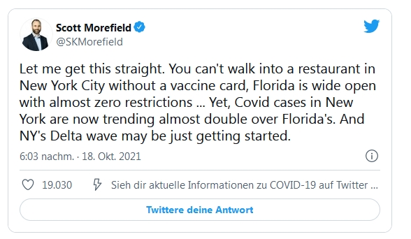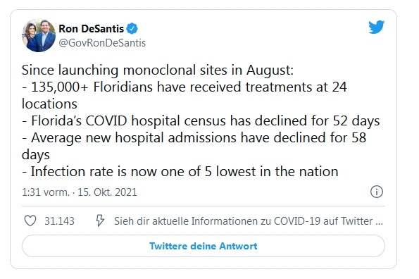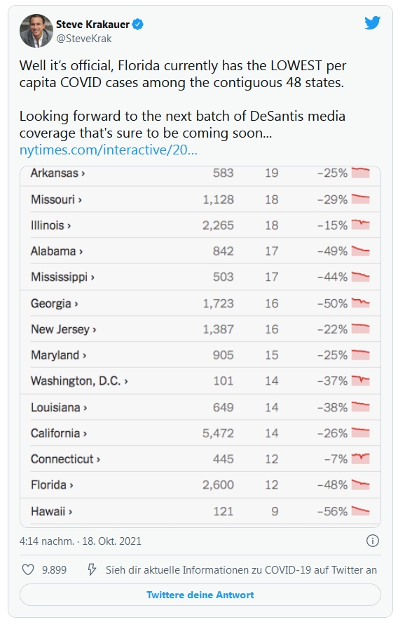 Selbst die lokalen Zeitungen in Florida wie Miami Herald, Orlando Sentinel oder der Tampa Bay Times schreiben nichts darüber. Aus irgendeinem Grund scheinen sie die COVID-Zahlen nur während der Atemwegssaison in Florida melden zu wollen, und sie scheinen immer zu vergessen, die Daten zu melden, wenn sie die Politik des Gouverneurs unterstützen – kennen wir aus Europa über das Beispiel Schweden.