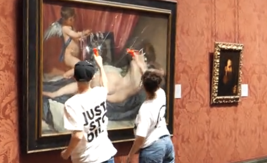 Dabei beschädigten sie mindestens das Sicherheitsglas vor dem Kunstwerk „Venus vor dem Spiegel“ des spanischen Barock-Malers Diego Velázquez. Das ist auf einem Video zu sehen, das die Gruppe in den sozialen Medien veröffentlichte. Ob auch das Bild beschädigt wurde, ist bisher unklar.