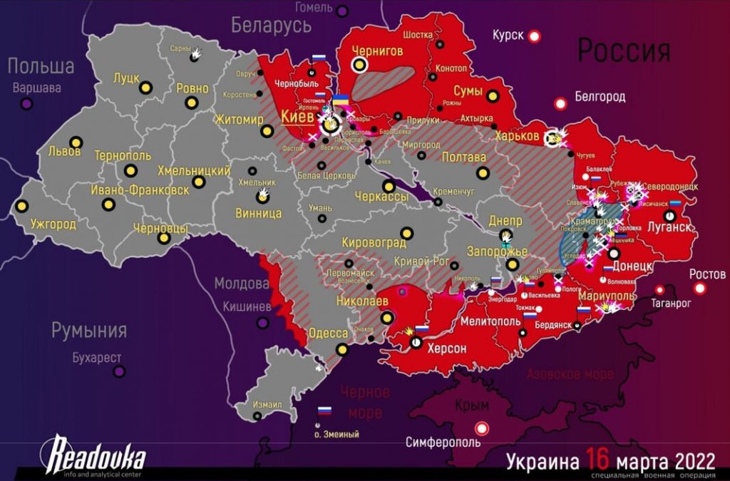 Die Truppen sind an der Donezk-Front (Ostfront) und im Raum Kiew (Südfront) vorgerückt, was auf einer Karte dieses Maßstabs jedoch nicht zu erkennen ist.