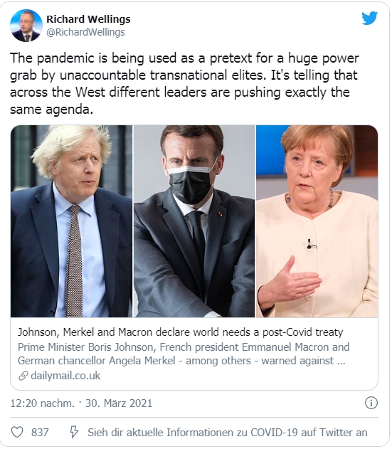 “Die Pandemie wird als Vorwand für eine gewaltige Machtergreifung durch transnationale Eliten, die man nicht zur Verantwortung ziehen können wird, ausgenutzt. Es ist bezeichnend, dass überall im Westen verschiedene Staatschefs genau dieselbe Agenda verfolgen.”