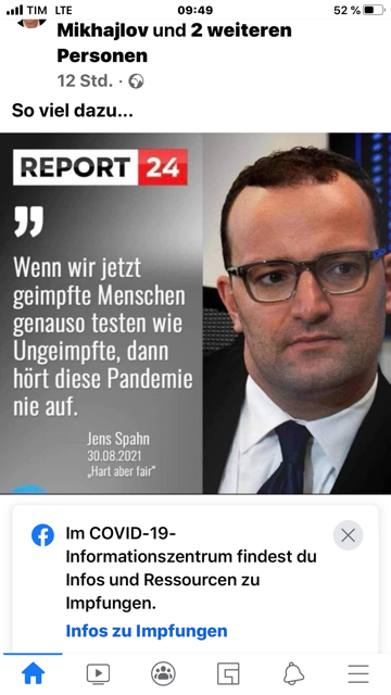 Sein Kommentar in Zusammenhang mit diesem Thema am 30.08.2021 bei „Hart aber Fair”: „Wenn wir jetzt geimpfte Menschen genauso testen wie Ungeimpfte, dann hört diese Pandemie nie auf”.