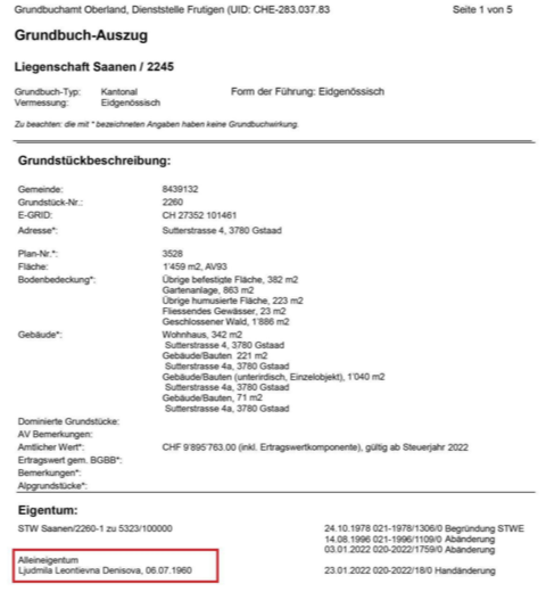Grundbuchauszug. Man beachte rot umrandet den Namen der Eigentümerin Denisova.