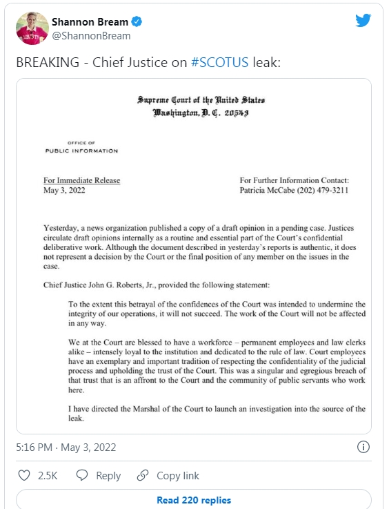 Gestern Abend wurde der Entwurf eines Urteils des Obersten Gerichtshofs der USA einem Journalisten zugespielt, der ihn veröffentlichte.