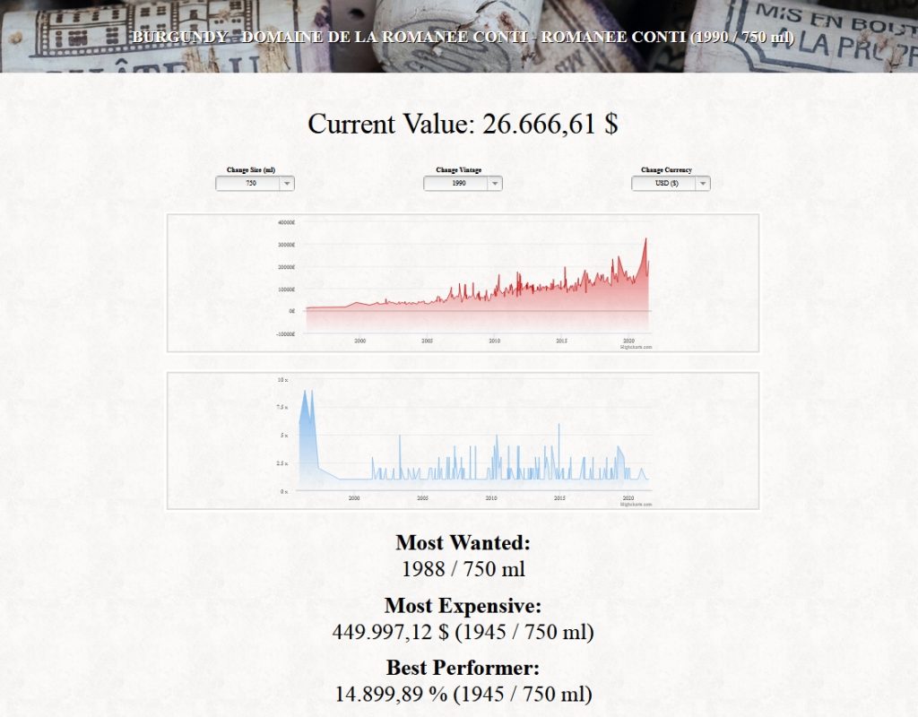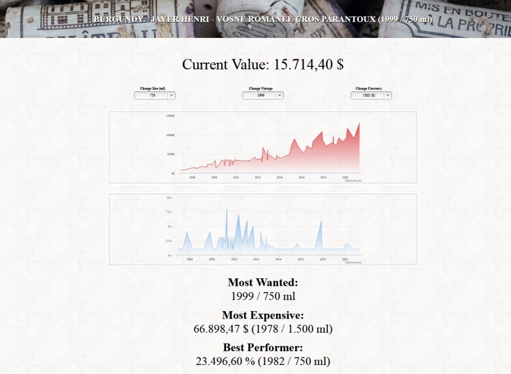 Berühmte Marken aus dem Bordeaux, wie Chateau Petrus, Chateau Lafite, Mouton Rotschild, Lafleur, Le Pin haben eine unglaubliche Wertentwicklung hingelegt. Auch das Burgund mit ihren unverwechselbaren Weingütern wie die Domaine de la Romanee Conti (DRC) Domaine d’Auvenay, Rene Engel, Meo Camuzet haben 4-stellige Wertsteigerungsquoten.
